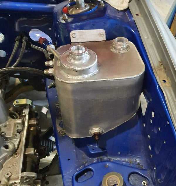 Inside, we fabricated custom seat mounts, a routed the fuel system, firebomb, and intercooler spray lines to handle the demands. A Mort Sport made coolant header tank was fabricated and fitted to maintain optimal cooling under race conditions, and we also included a Group A style rally-spec oil cooler tank to improve engine longevity on long competitive stages.