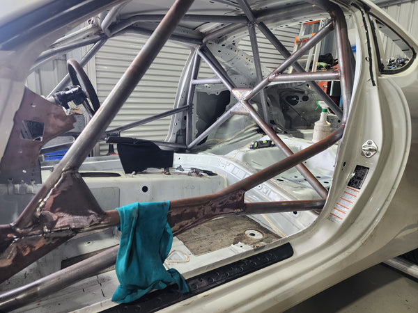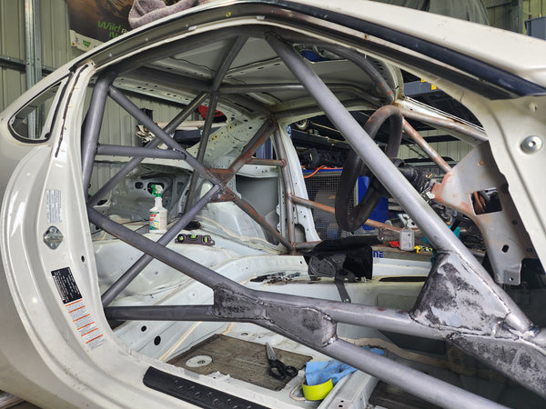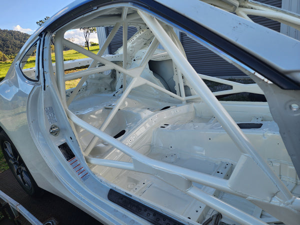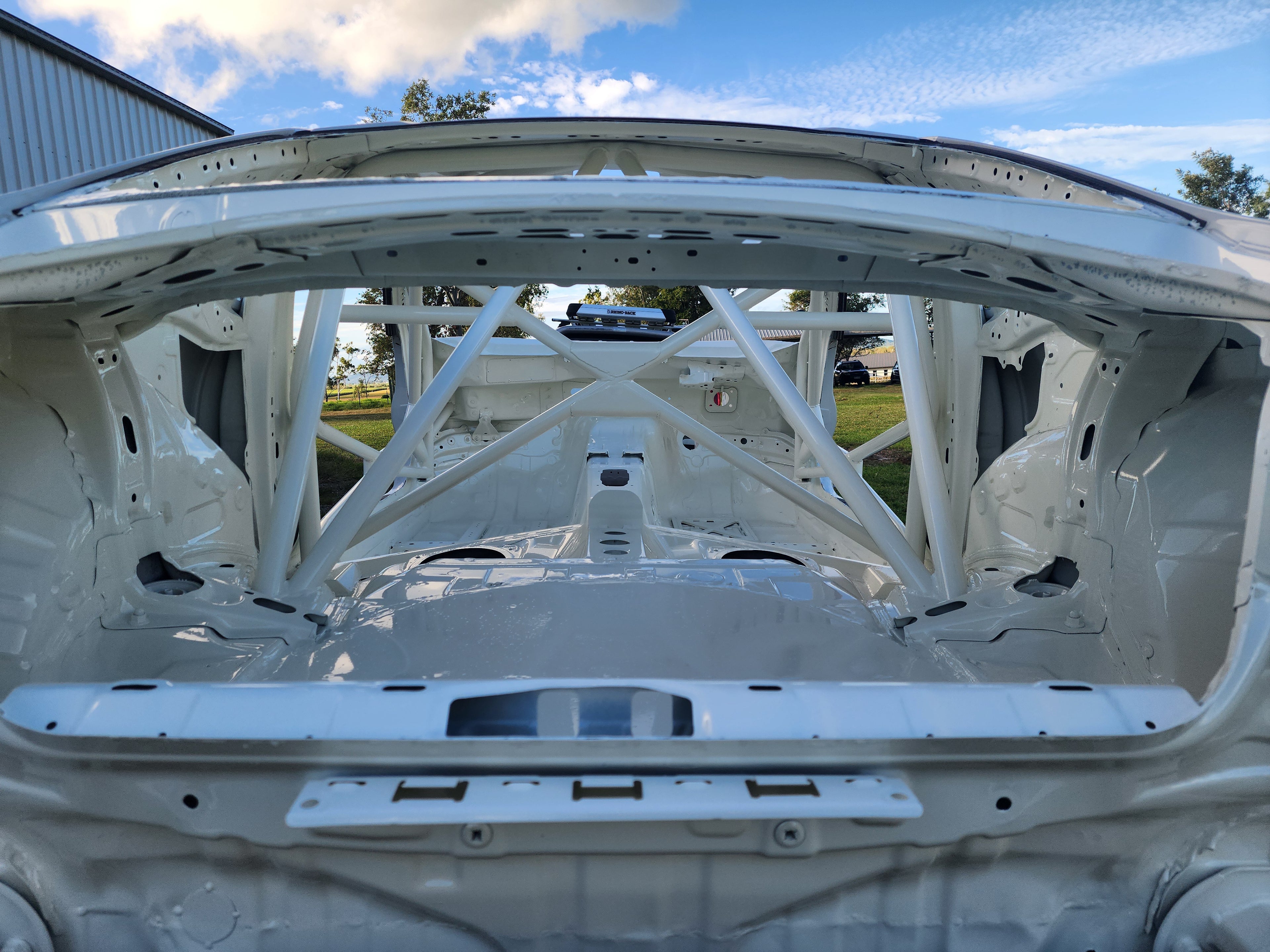 A custom roll cage was installed to Motorsport Australia specs, and we began test-fitting key components. After seam welding, closing unnecessary holes, preparing for safety and strength, and dry-fitting key components we gave the shell a fresh coat of paint and began the next stage of the rebuild.
